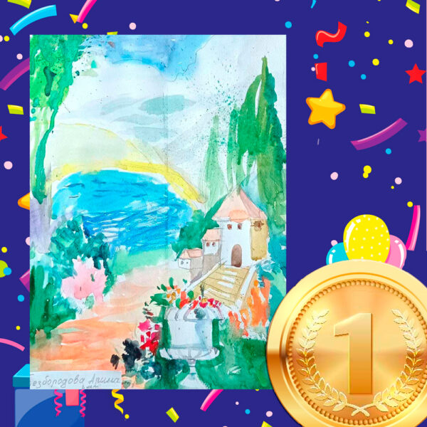 1 місце: Аріна Безбородова Робота 8-річної переможниці отримала 917 лайків. Дівчина зобразила куточок сонячної Італії, в якому вона мріє провести літо разом із матусею. Аріна отримує головний подарунок Конкурсу — самокат. |