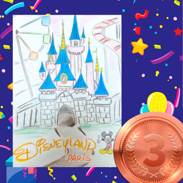3 місце: Мирослава Дрозд Робота 11-річної дівчини набрала 411 лайків. Мирослава намалювала Діснейленд, який знаходиться у містечку Марн-ла-Валле, що під Парижем. На Мирославу чекає набір для творчості. |